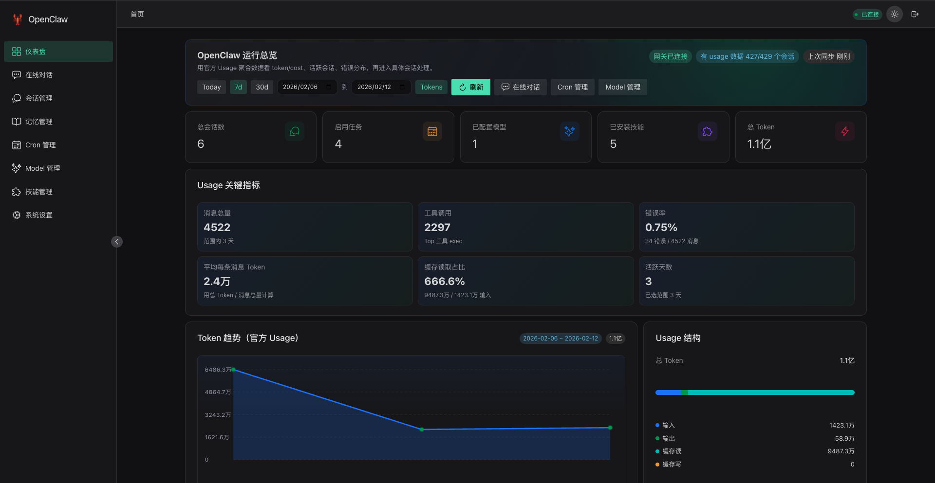 - 仪表盘:会话、Cron、技能、模型与 Usage 概览